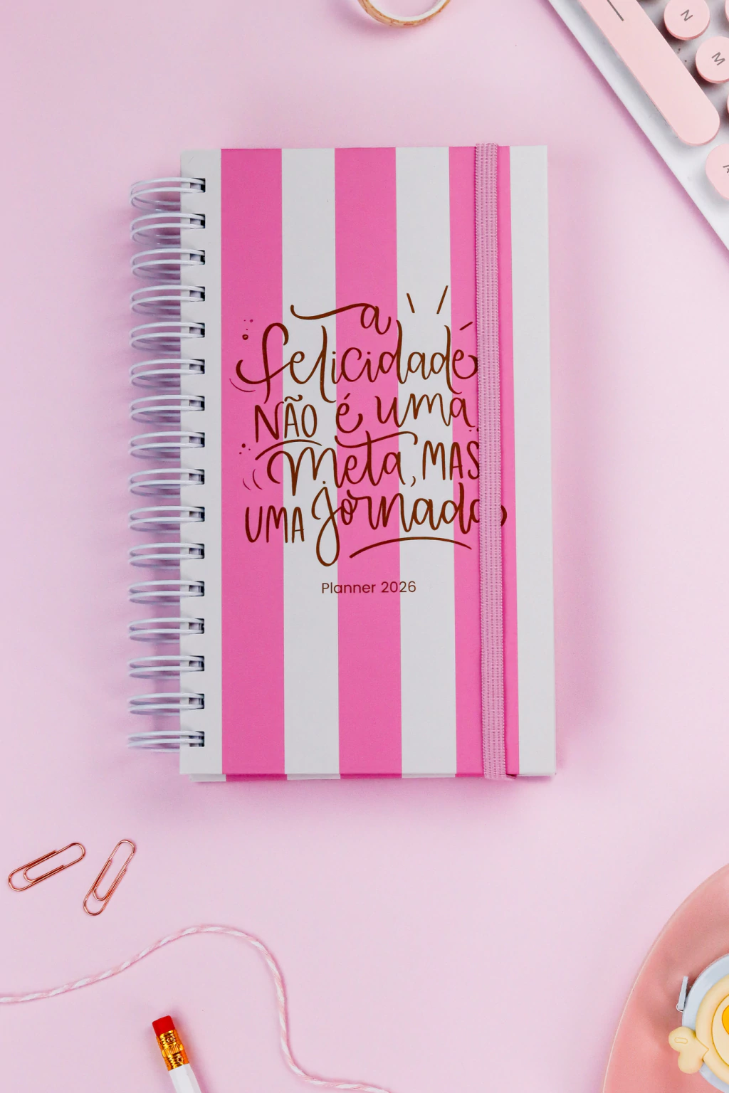 Bolso Organizacional, Página de Dados, Cartela de Adesivos, Calendário 2025 e 2026, Lista Telefônica, Logins e Senhas, Controle de Saúde, Planejamento Anual, Metas do ano, Controle Financeiro Mensal, Planos de Viagens, leituras, séries, e Roda da Vida + 01 marca página de brinde.